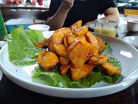 - Khoai lang kéo sợi: Cắt khoai lang thành miếng, rán chín. Đổ dầu vào chảo, thêm thật nhiều đường trắng, đun lửa nhỏ đến khi đường chuyển thành dạng keo, sau đó cho khoai vào rồi trộn đều. Ăn nóng. Nếu dùng đũa gắp có thể kéo khoai thành sợi dài, vì vậy nên mới gọi là “khoai lang kéo sợi”.